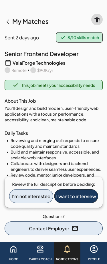 For accessibility, I initially used a Google Material icon, but testing showed it wasn’t intuitive, so we replaced it. We also simplified “93% match” to “8/10 skills match,” since users preferred more concrete metrics. Accommodations were consolidated into one button that reassures users their needs will be met, with details available on click. I also added a “Contact Employer” option and a confirmation step for “I’m not interested,” so users retain more control and don’t lose opportunities by accident.