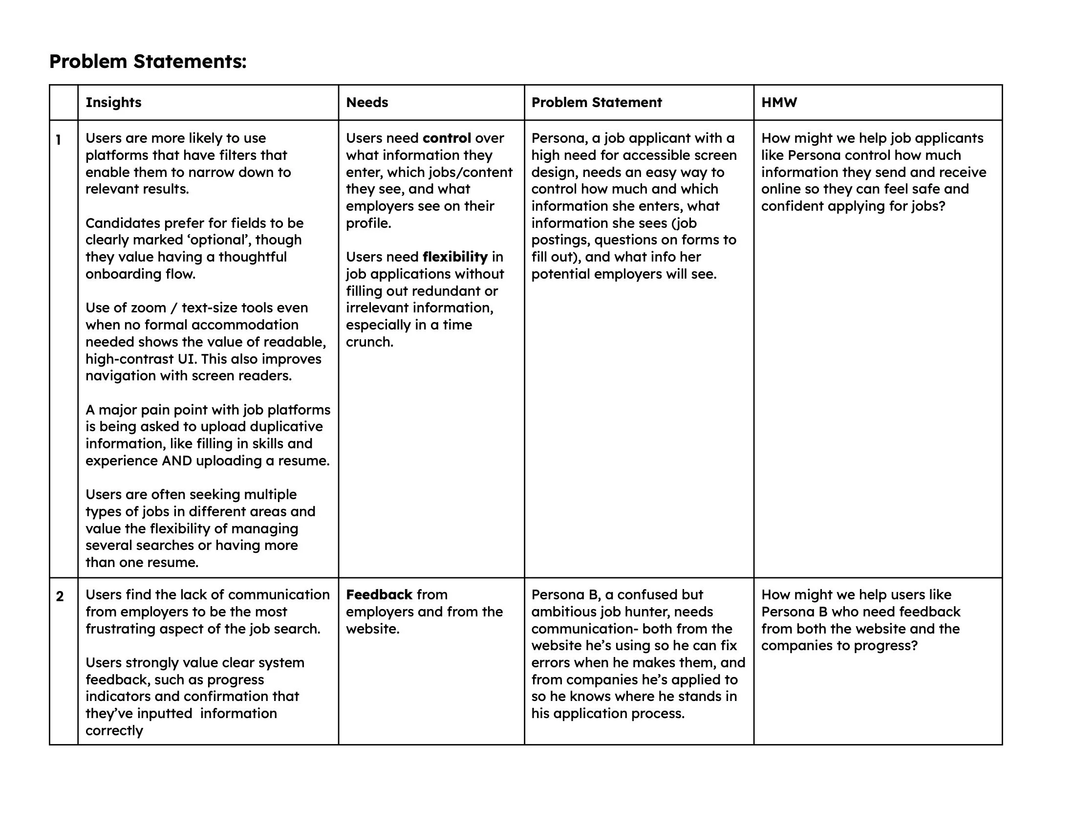We created this chart by synthesizing insights from user interviews. These insights were distilled into clear user needs, which then guided the development of problem statements and “How might we” questions to shape our design direction.