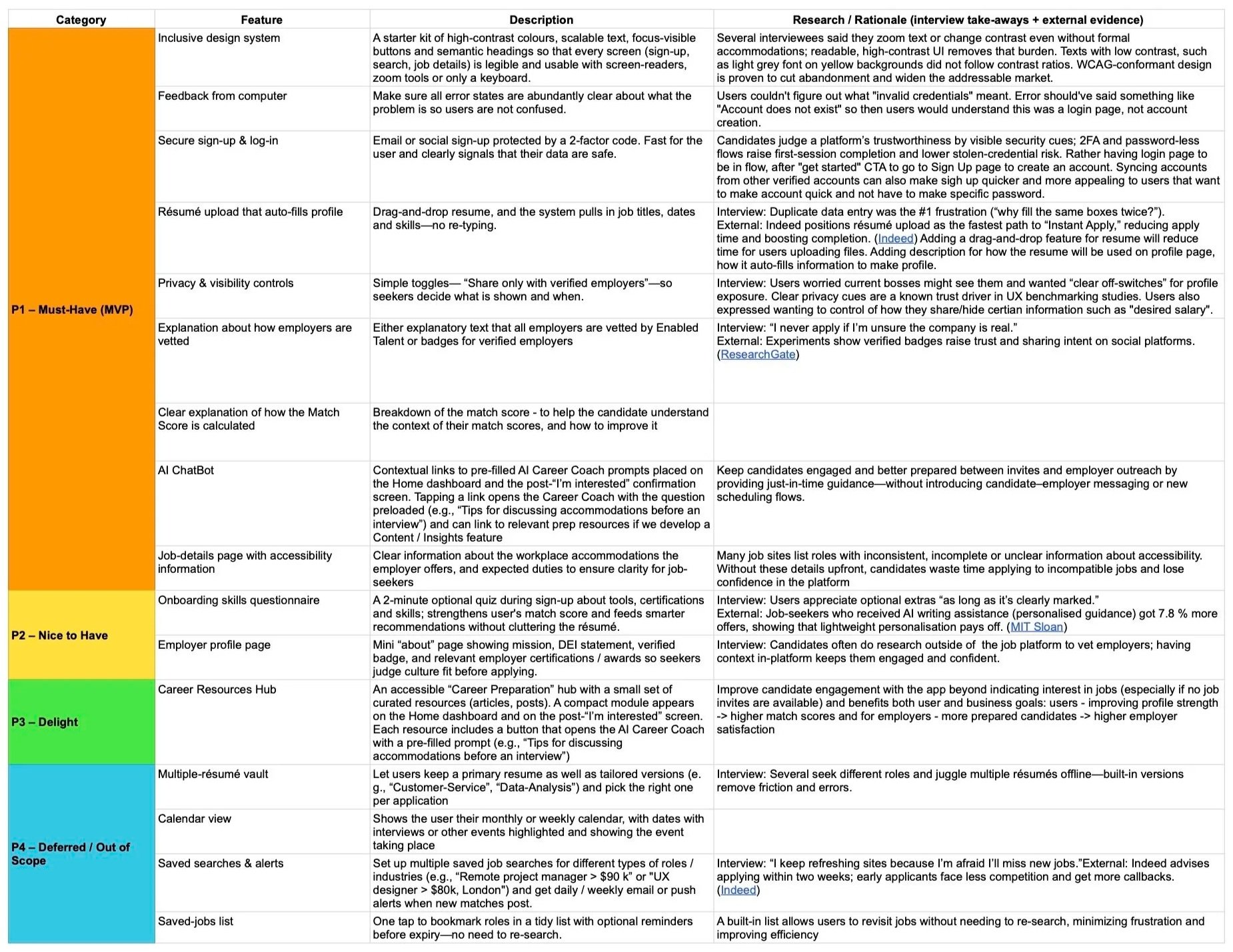 Overall takeaway: While the platform shows strong potential, its current design creates major accessibility barriers and usability frustrations. Addressing these issues—especially around accessibility standards, clearer navigation, and a smoother onboarding experience—will be essential to building trust with job seekers and ensuring inclusivity.