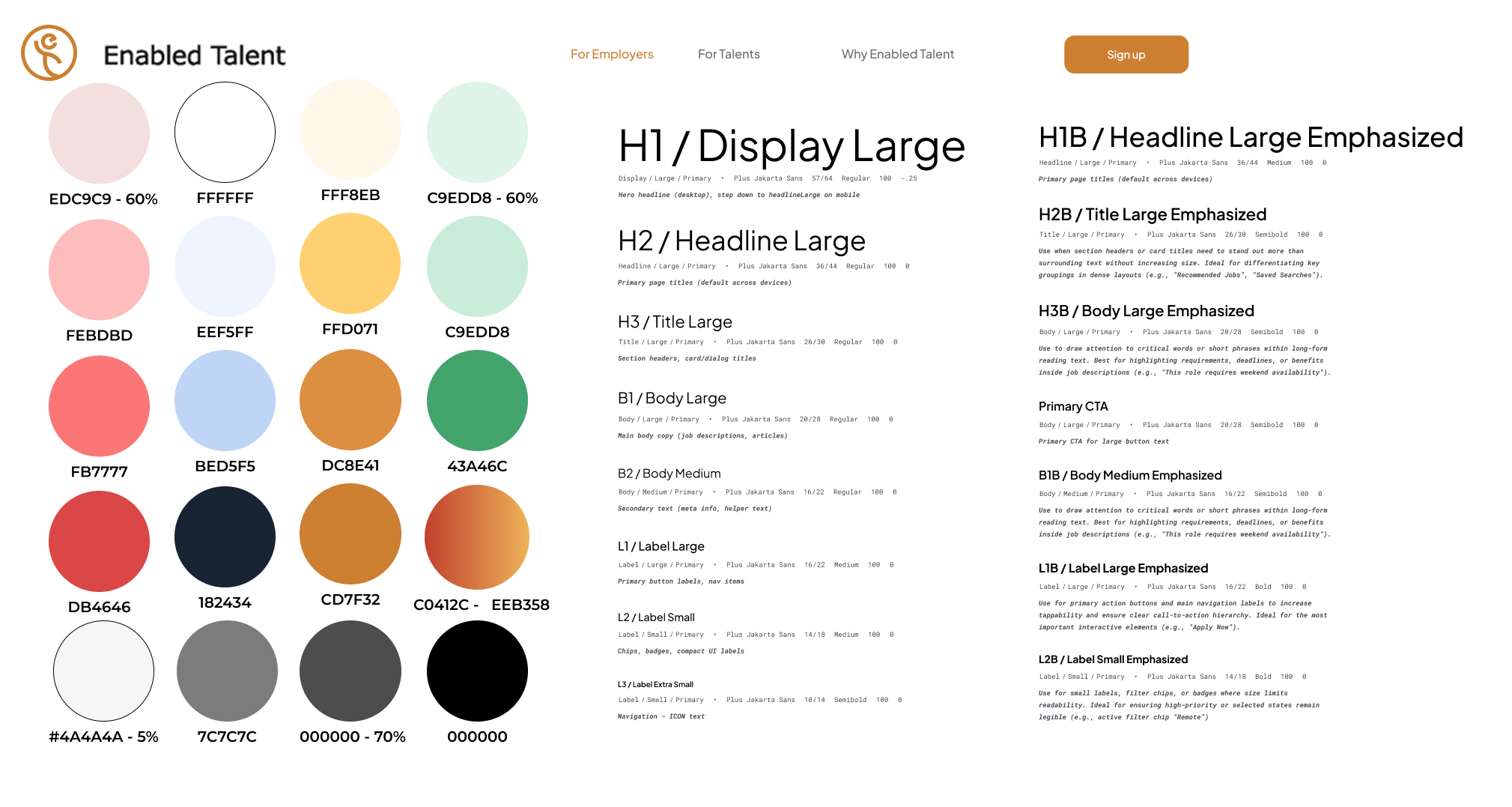 Our UI kit was comprehensive, covering components, spacing, grids, corner radii, and more. We documented every detail to ensure consistency across the design system. For a closer look, explore the Figma file here: https://www.figma.com/design/hNiXiCgDhZND2eC4wTWtH9/Enabled-Talent?node-id=2559-63738&t=k8GUq3nc5W9FbmNi-1