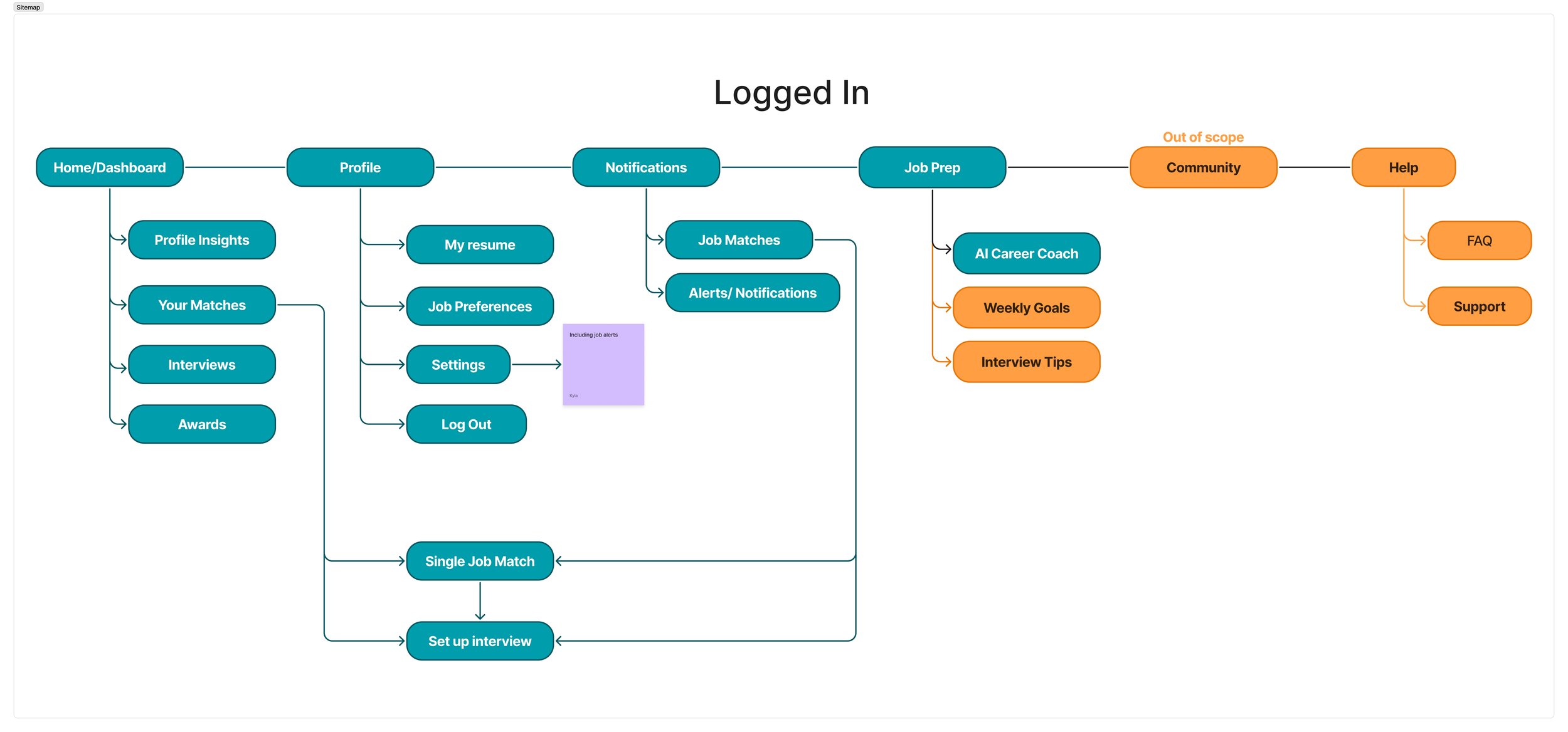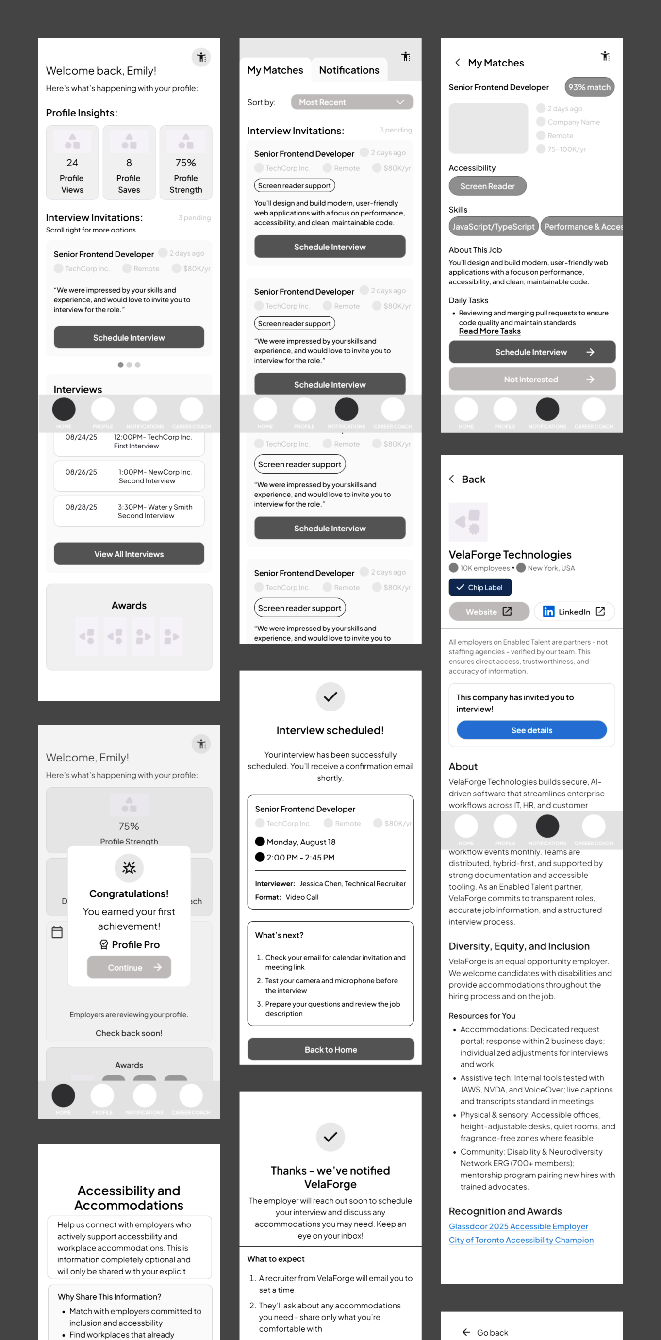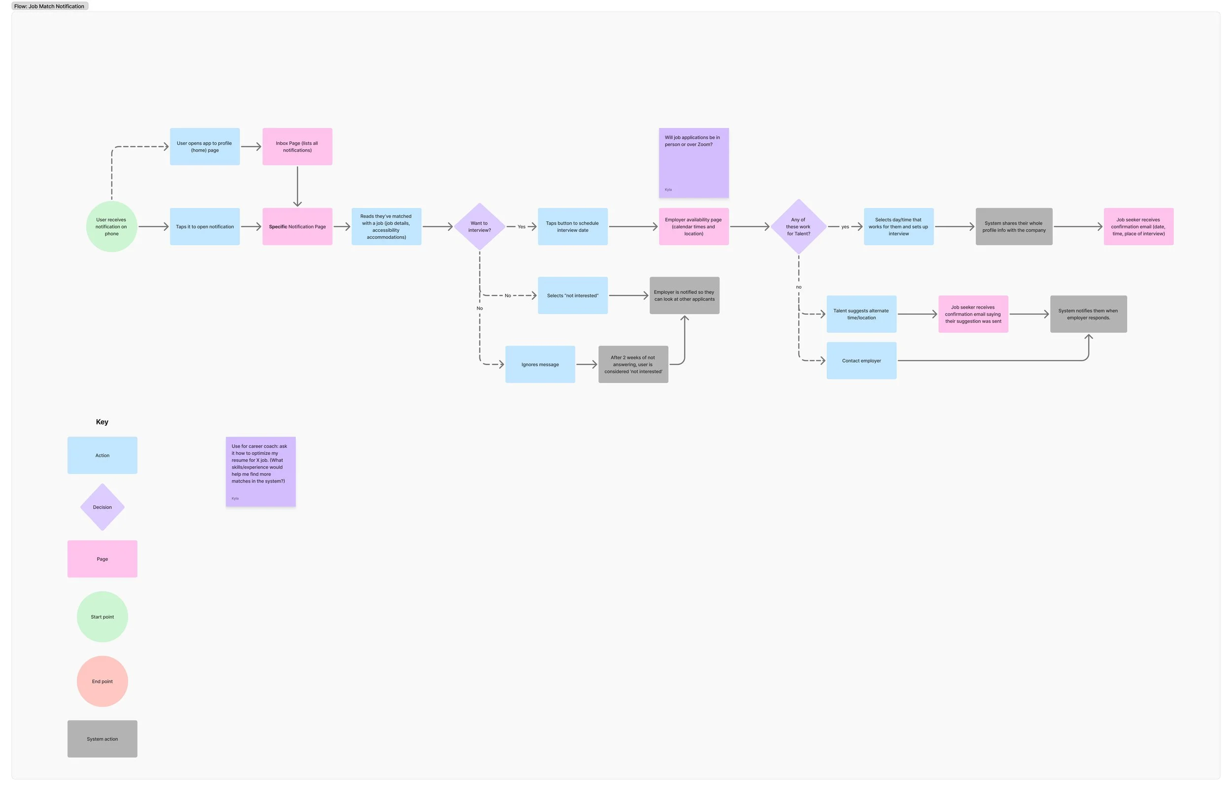 In our initial interviews, we asked participants about their job-seeking experiences and their perspectives on accessibility—both personally and through others they know. We then observed them navigating the current website, focusing on the sign-up process, profile creation, and the career coach feature