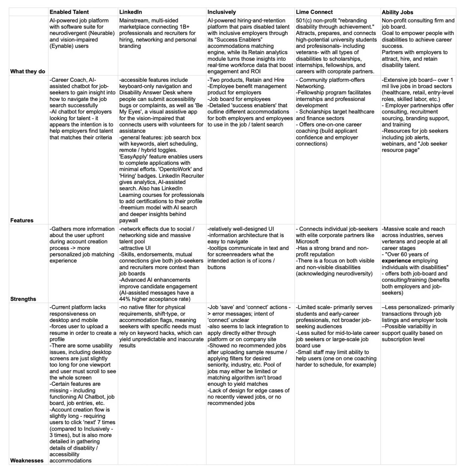 To better understand the market, we analyzed Enabled Talent alongside four competitors: LinkedIn, Inclusively, Lime Connect and Ability Jobs. These were the key findings: